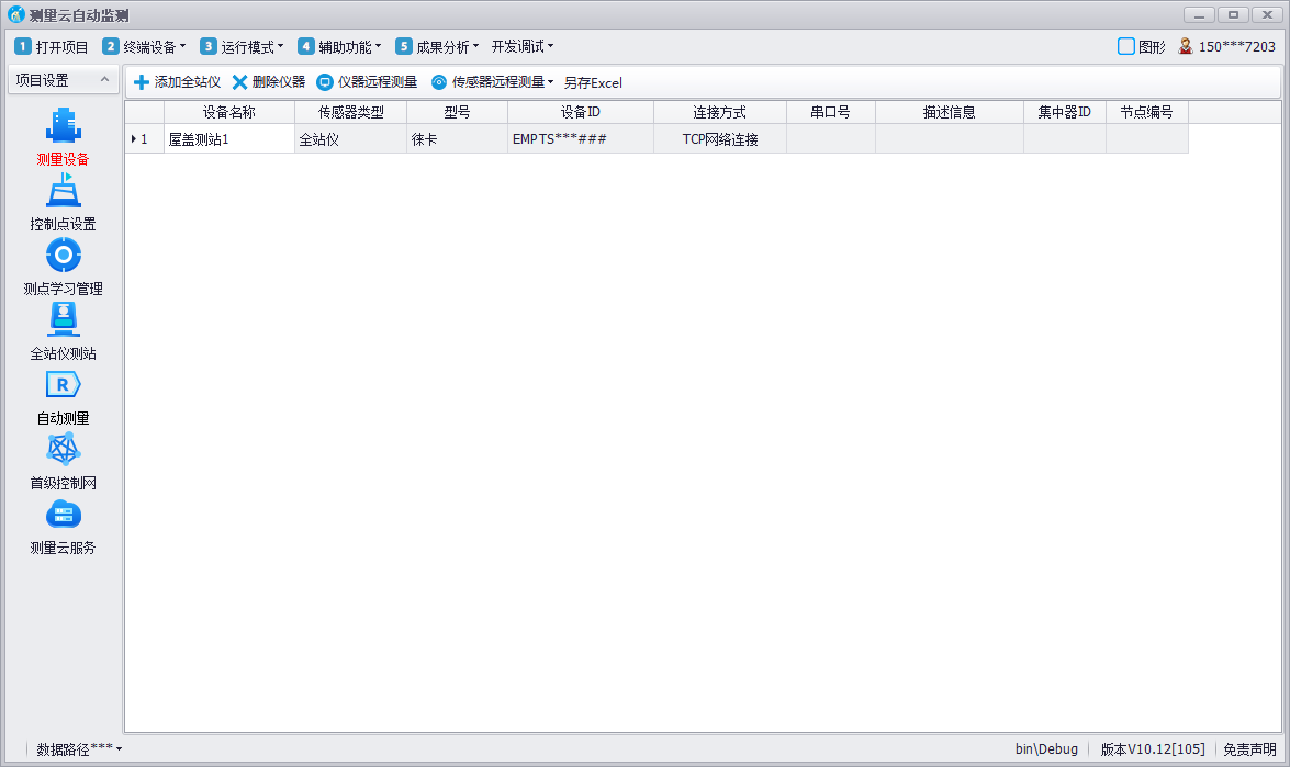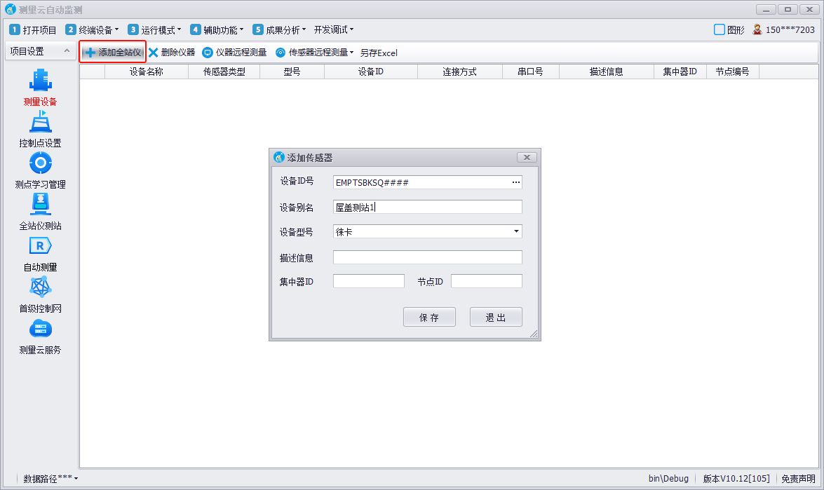 02添加全站仪设备 创建日期 2025年12月23日 提交人 admin 类别 全站仪自动监测系统(2025.12) (1)进入设备管理界面,左侧工具栏,点击测量设备,如图: (2)设备管理界面,工具栏点击“添加全站仪” 设备ID号:仪器对应采集箱的设备码; 设备别名:仪器安装测站编号+仪器序号 (1)添加设备成功