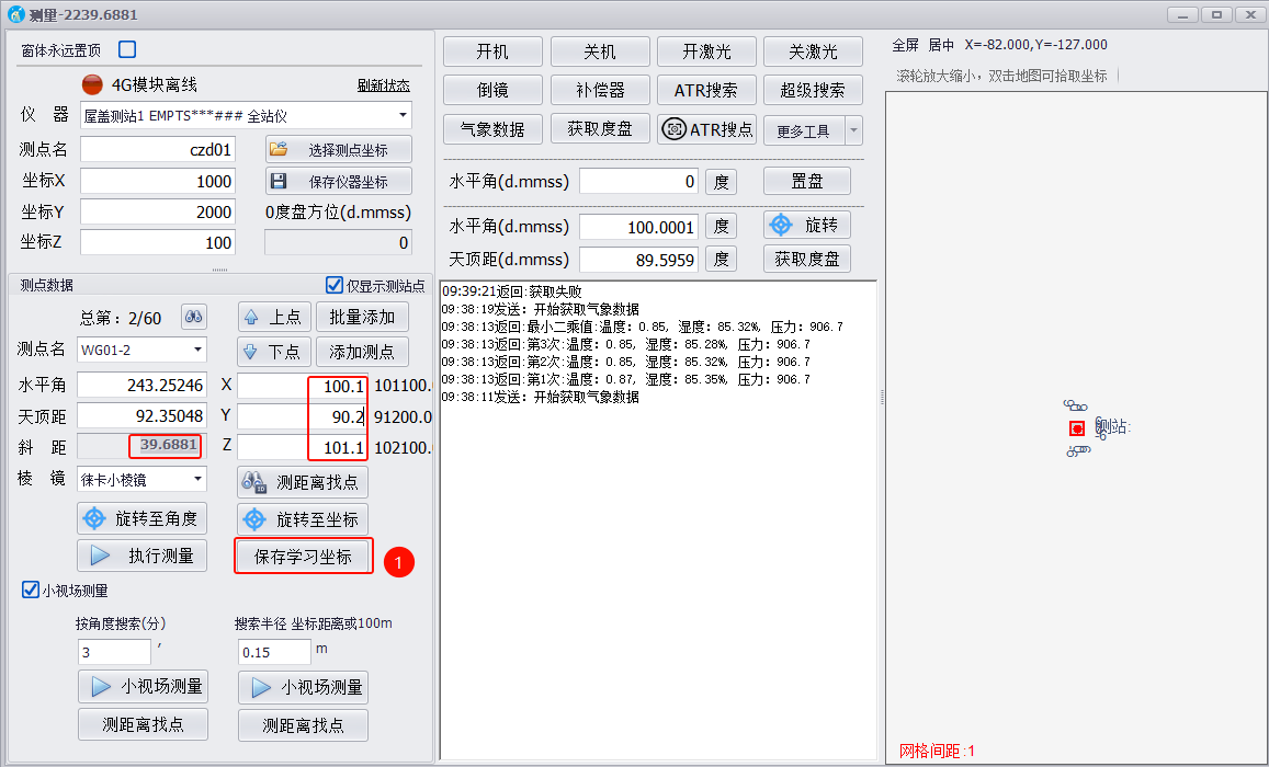 如果测量成功,斜距、x、y、z坐标结果会实时显示,保存学习坐标,即可进入下一点测量。