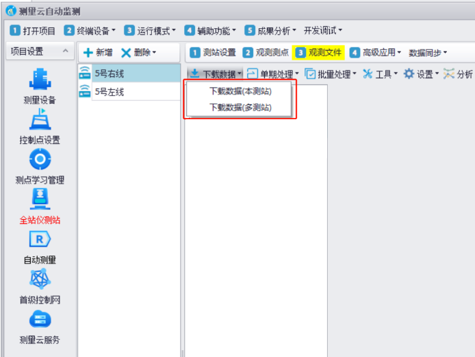 (1)下载数据(本测站),只下载左侧所选的测站“5号右线”,点击下载按钮,弹出对话框,选择下载日期,点击下载,如图: