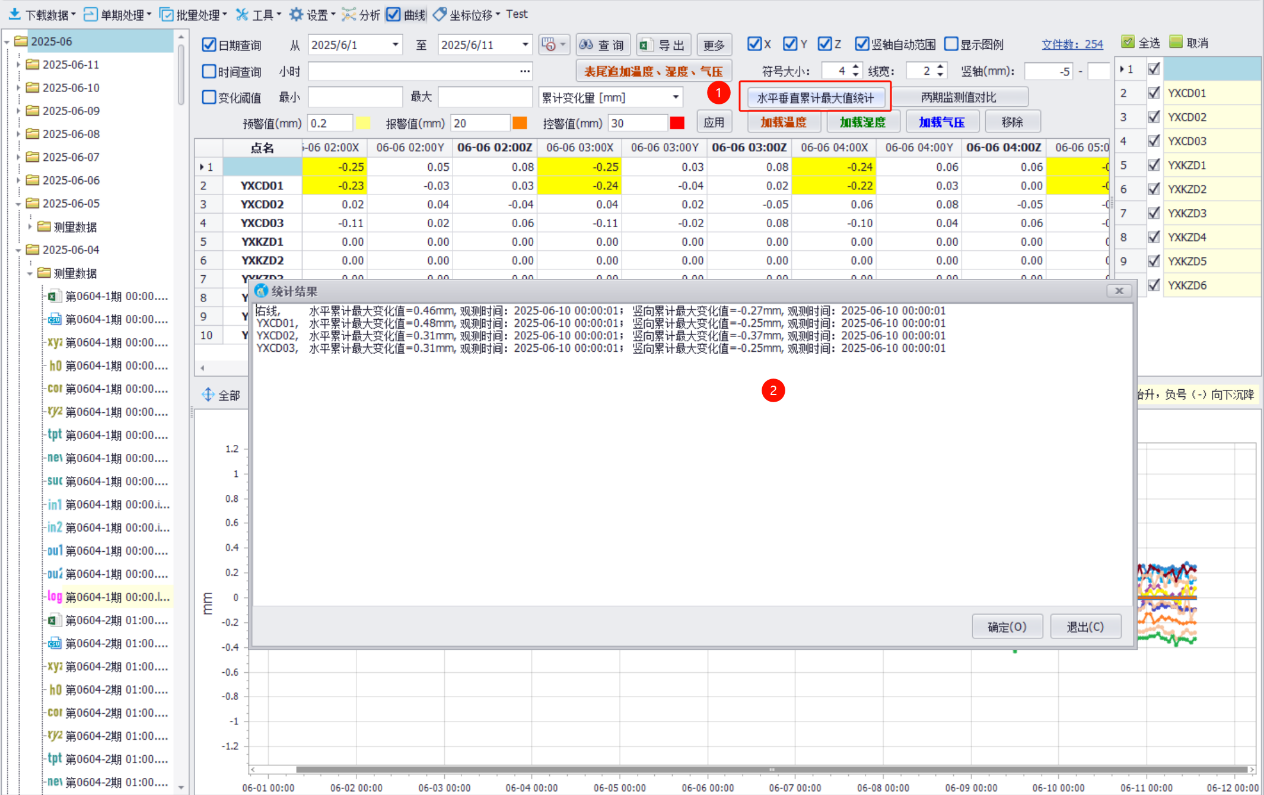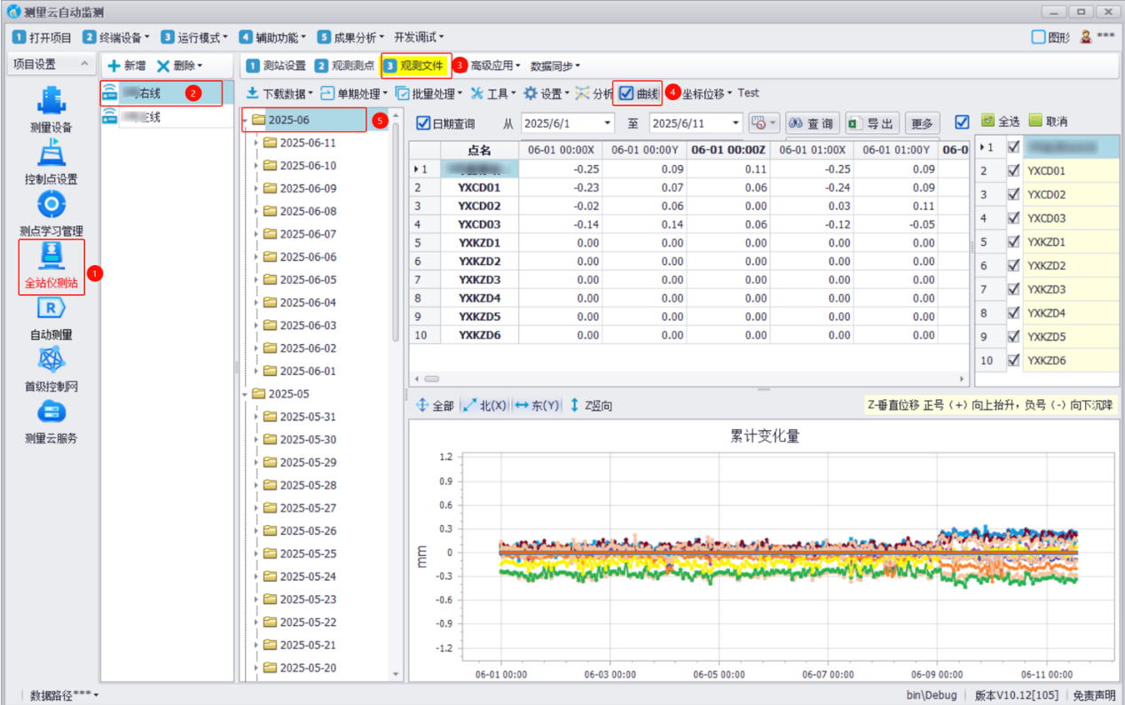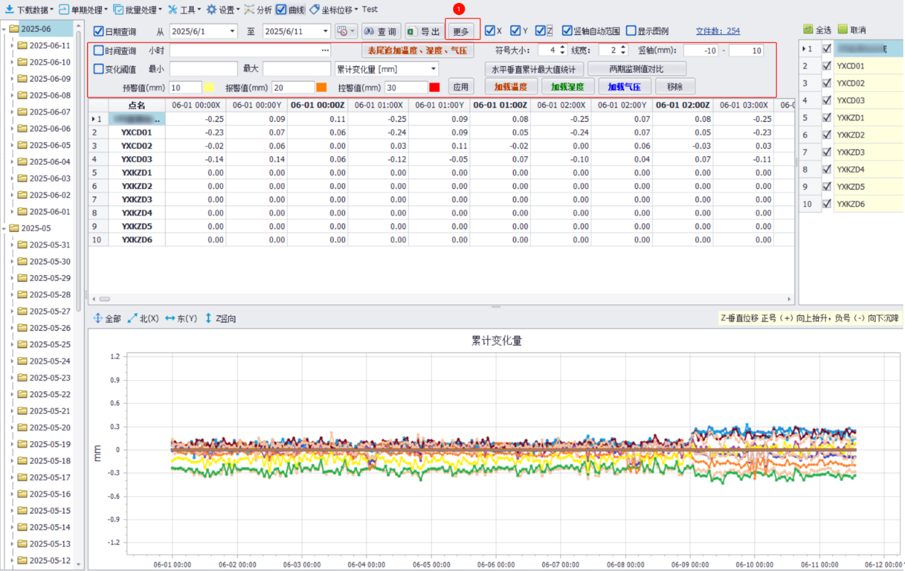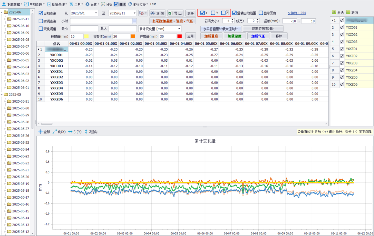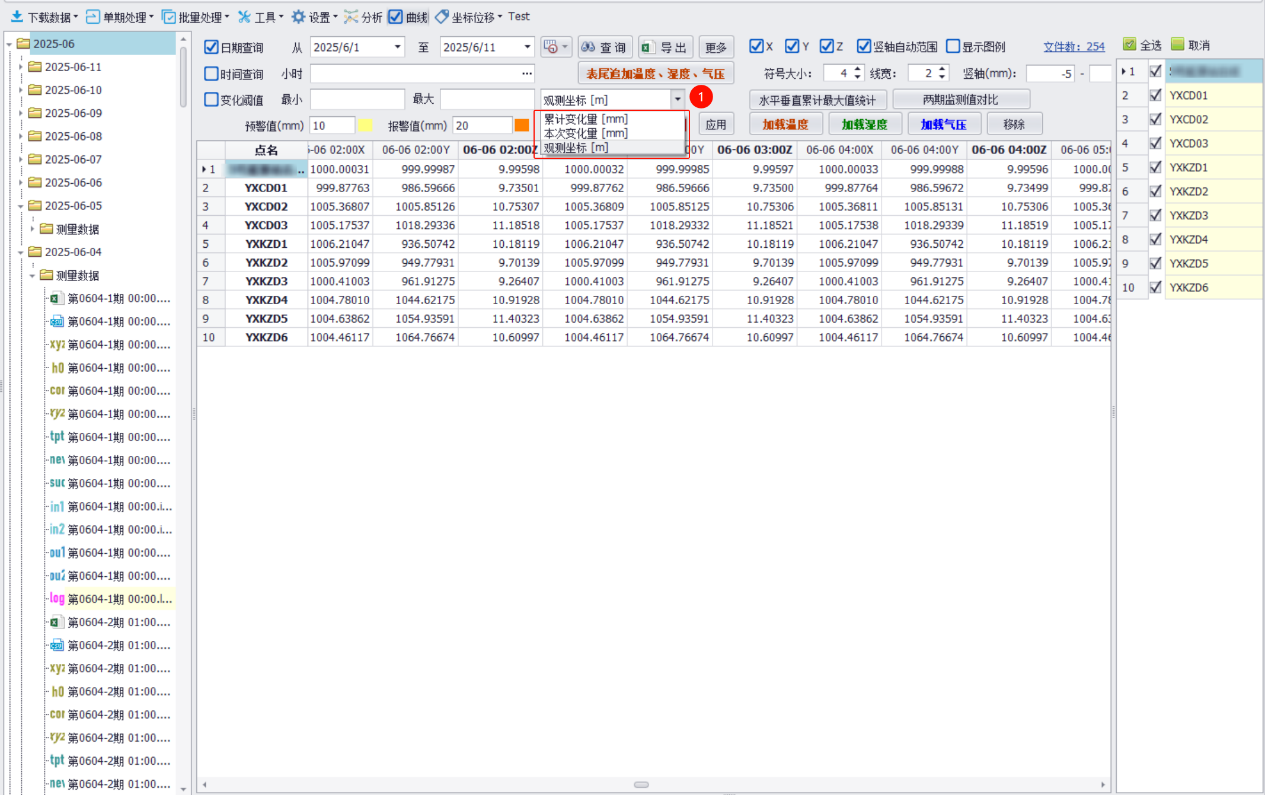 系统支持累计变化量、本次变化量、观测坐标选择浏览,如图: