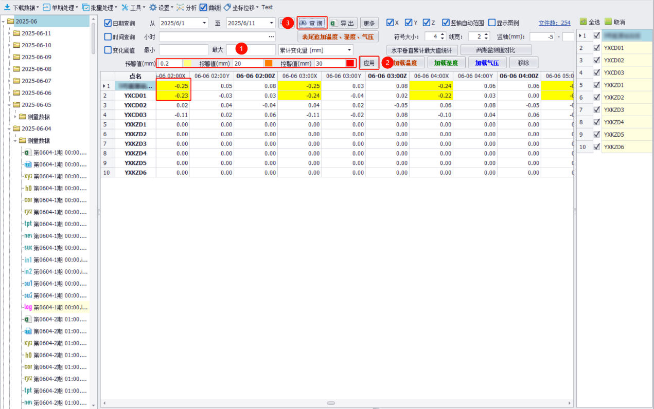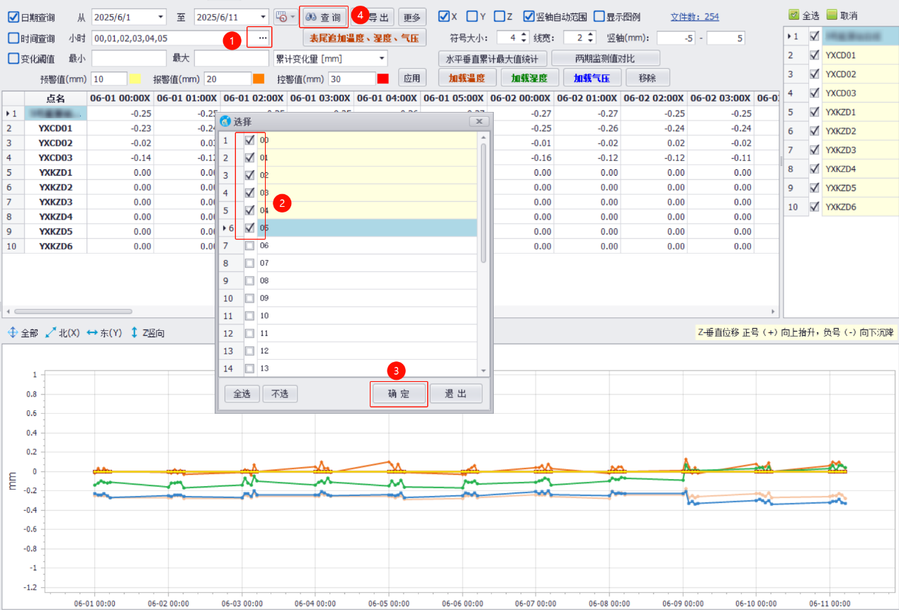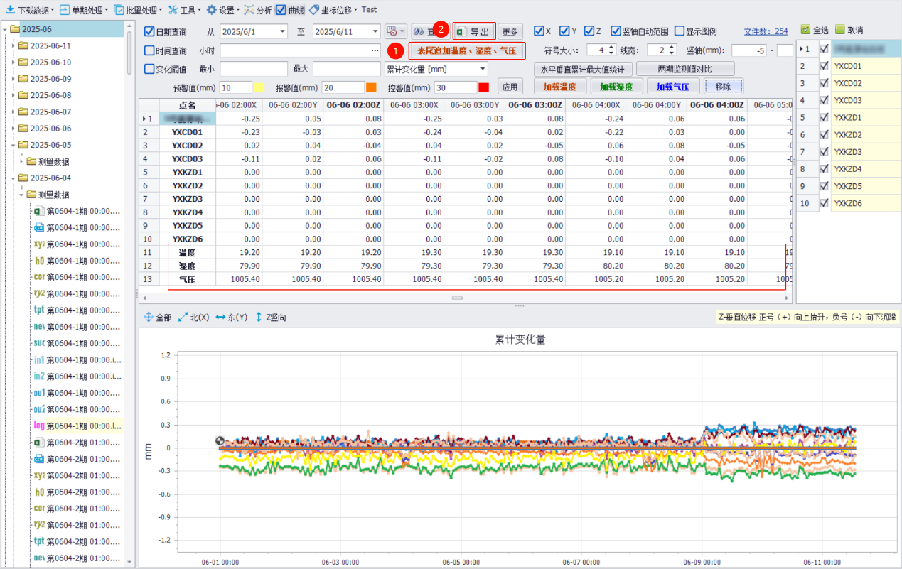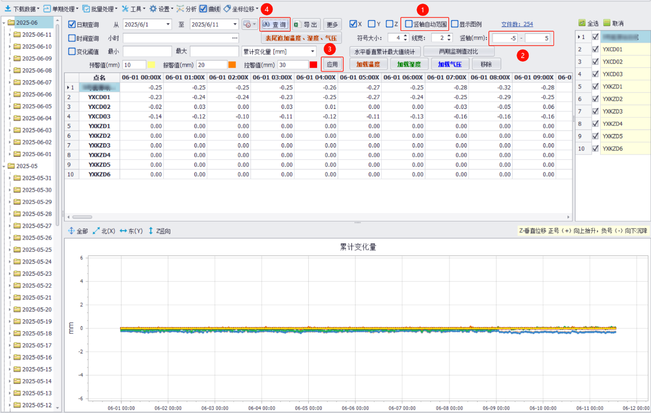 系统支持累计变化量、本次变化量、观测坐标选择浏览,如图: