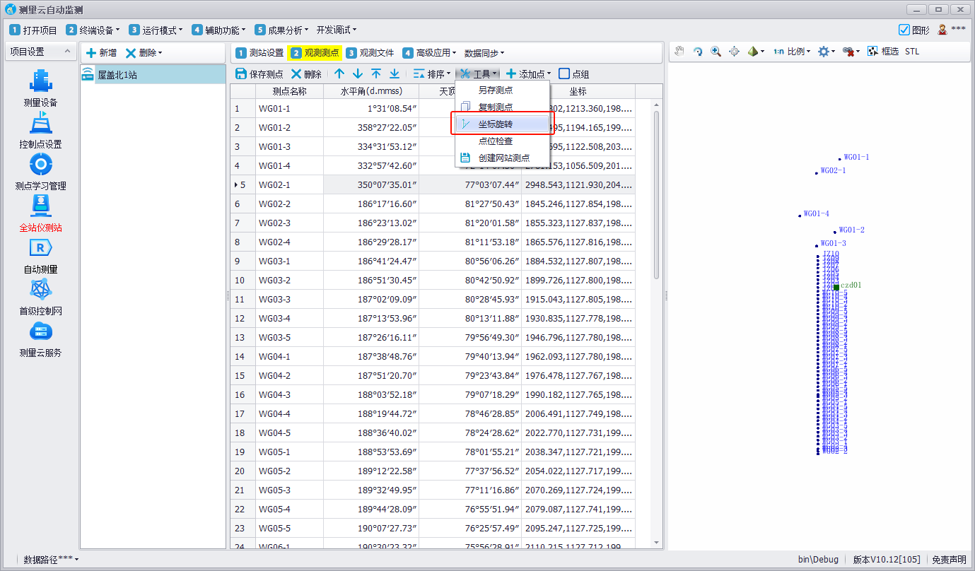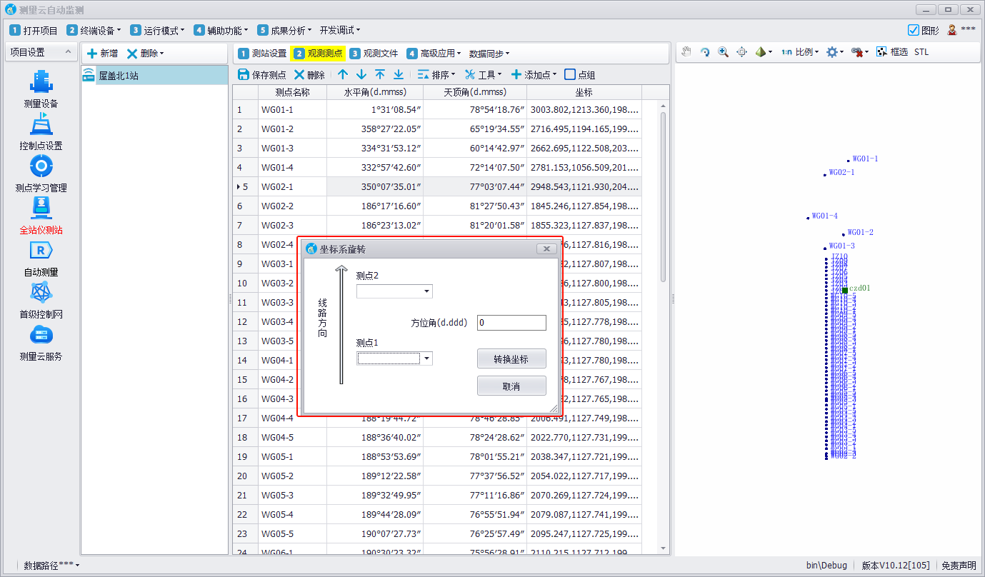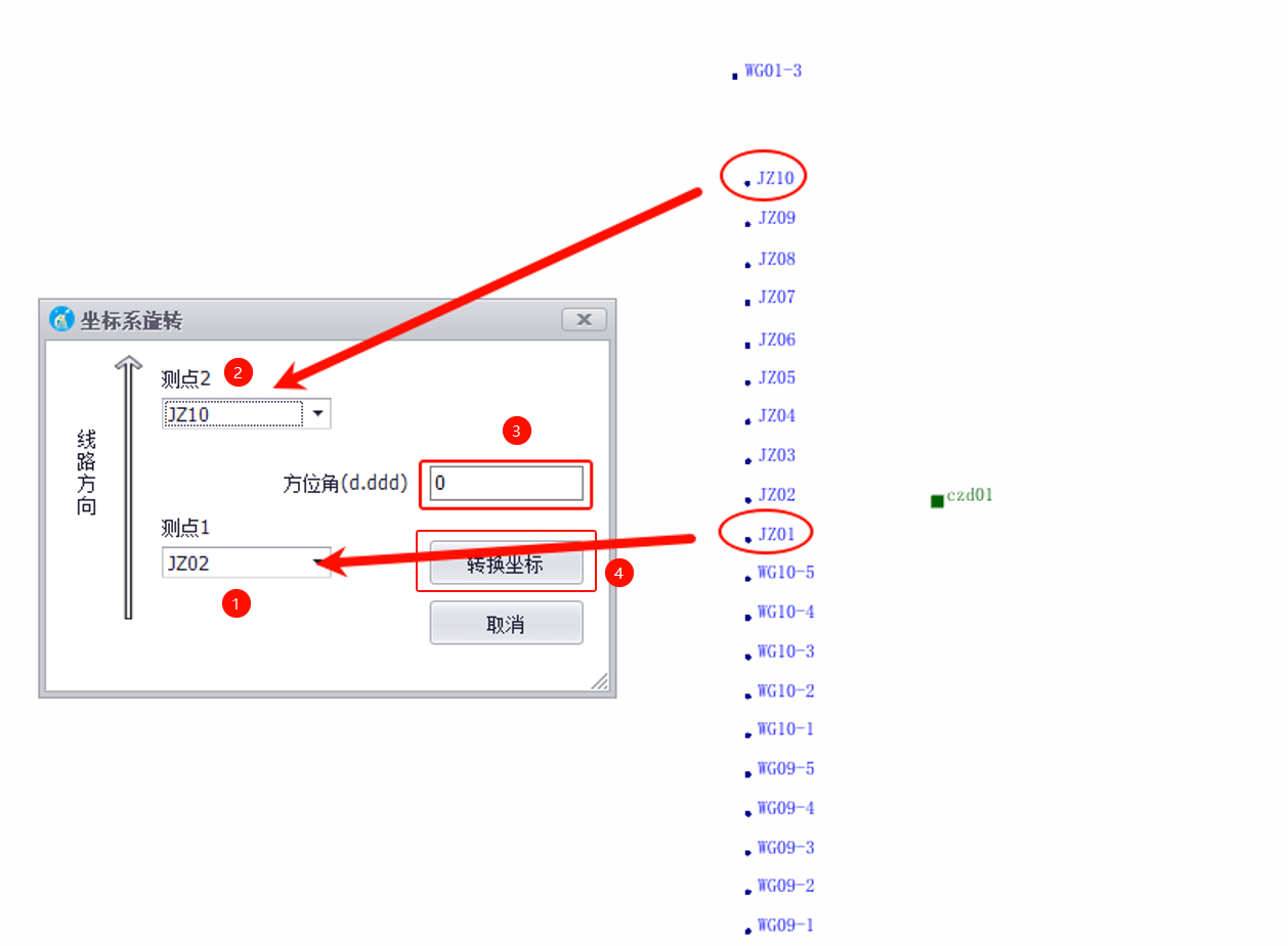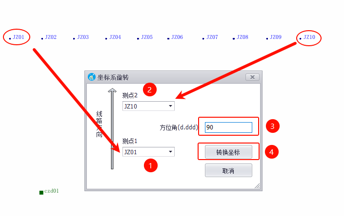 坐标旋转通过选择一条直线上的两个点,并设置测点1至测点2的方位角。
