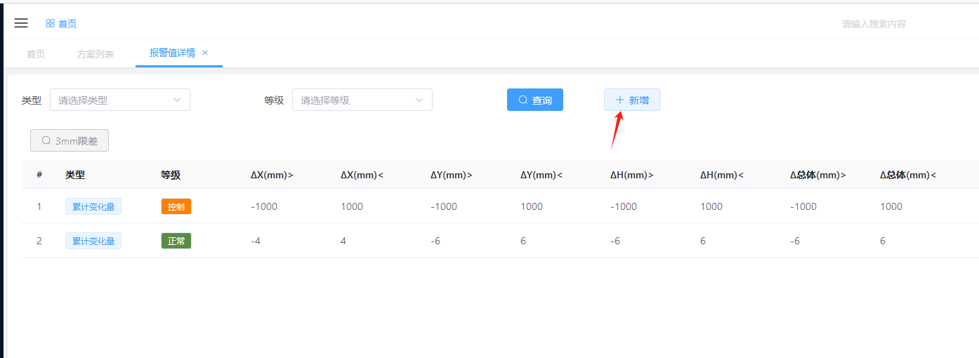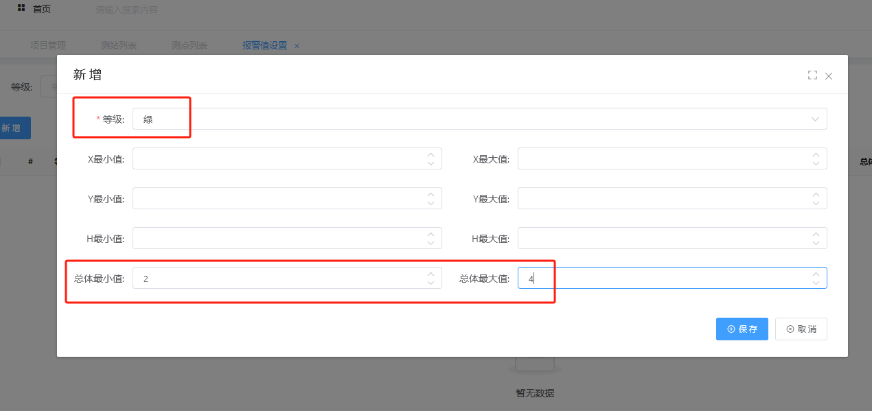 选择等级,输入总体最小值,总体最大值,单位是mm。如图所示,表示测点变化量在2mm – 4mm之间,将会触发绿色报警。