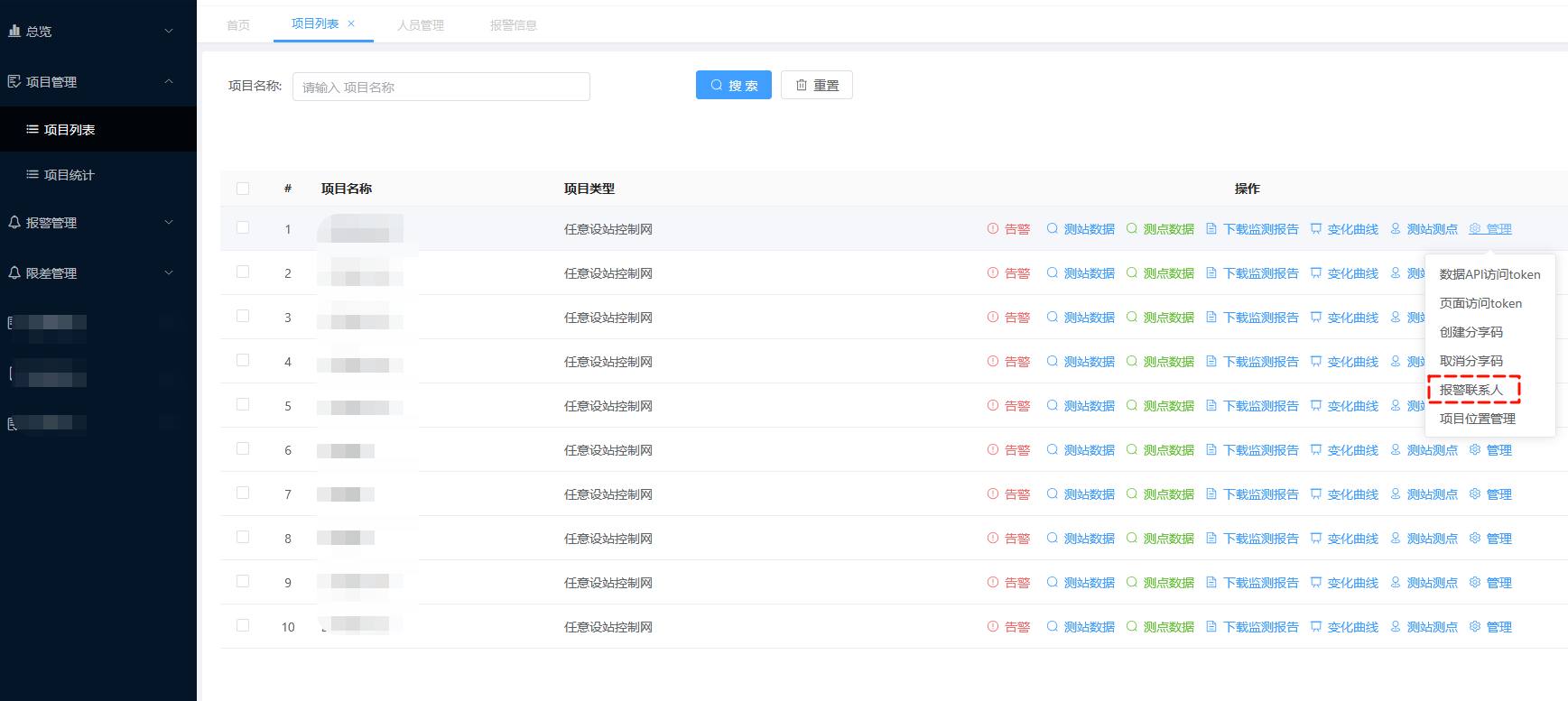 在“项目列表”页面点击“报警联系人”,设置此项目的报警短信接收人信息。